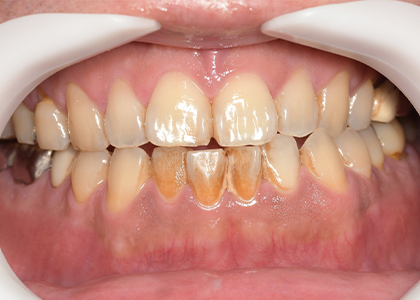 | 担当者所見 | この患者様は毎日コーヒーを飲むとのこと。コーヒーを飲んだ後は着色を防ぐために水を飲むか口を濯いでいただく。 また、ステイン除去効果のある歯磨き粉を使用していただく。 |