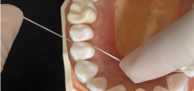 歯と歯の間についた歯垢(プラーク)は、歯ブラシでは落とせないため、フロスを使用して除去します。歯ブラシでは60%程度しか汚れを落とすことができません。