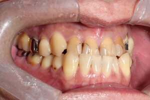 | 担当者所見 | ジルコニアステインクラウンは透明感がないため、1本のやり変えだと隣の天然歯と色味が合わないが、今回は5本のためジルコニアステインクラウンで作製できた。 |