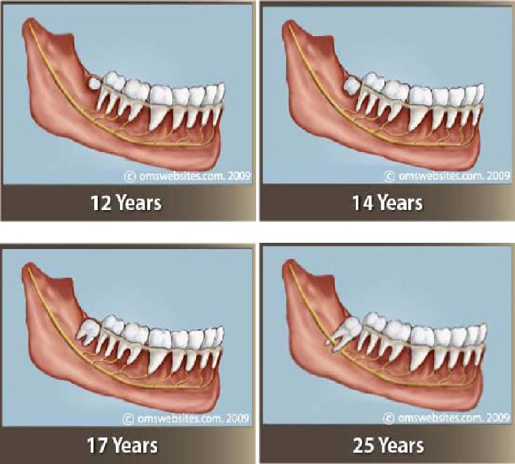 普通の永久歯は14~16歳で完全に生えそろいます。 ただし、親知らずは20歳前後にいきなり根元から生えてくるわけではないのです。